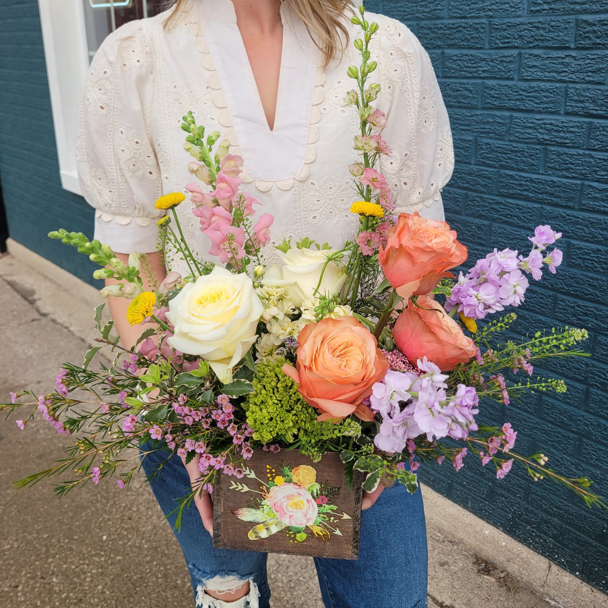 This arrangement is designed to feel like a little garden in full bloom—lush, layered, and full of movement. Featuring a curated mix of premium blooms in soft, cheerful tones, each piece is thoughtfully arranged in a keepsake container that makes it feel just a little more special than your everyday vase.