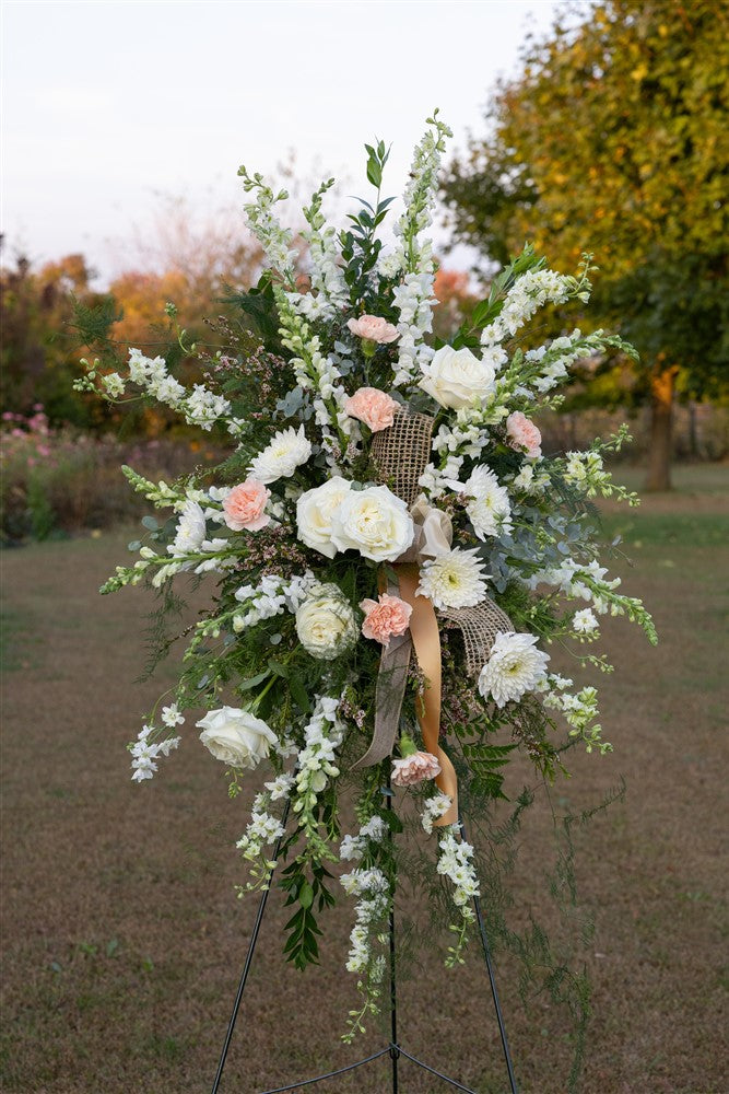 A lush, elegant display of blooms in soft whites, creams, and blush tones. Designed with roses, stock, carnations, and seasonal greenery, this standing spray offers a timeless expression of love and remembrance. Beautifully arranged with natural texture and gentle movement, it’s a heartfelt tribute for any memorial or service.